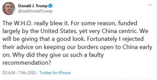 Geçtiğimiz günlerde “Önümüzdeki iki hafta maalesef çok zor geçecek ve maalesef çok fazla can kaybı olacak” açıklamasını yapan ABD Başkanı Donald Trump’tan, Dünya Sağlık Örgütü’nü hedef alan bir açıklama geldi.