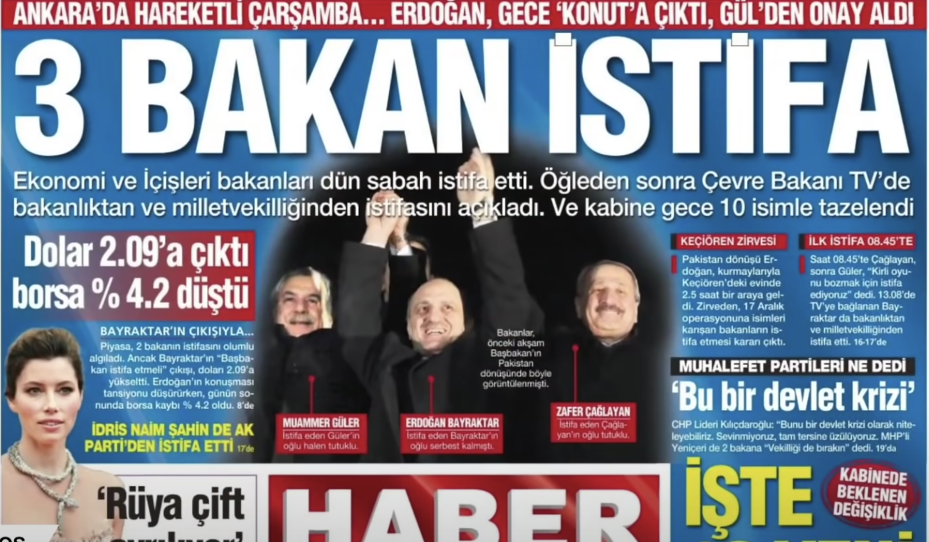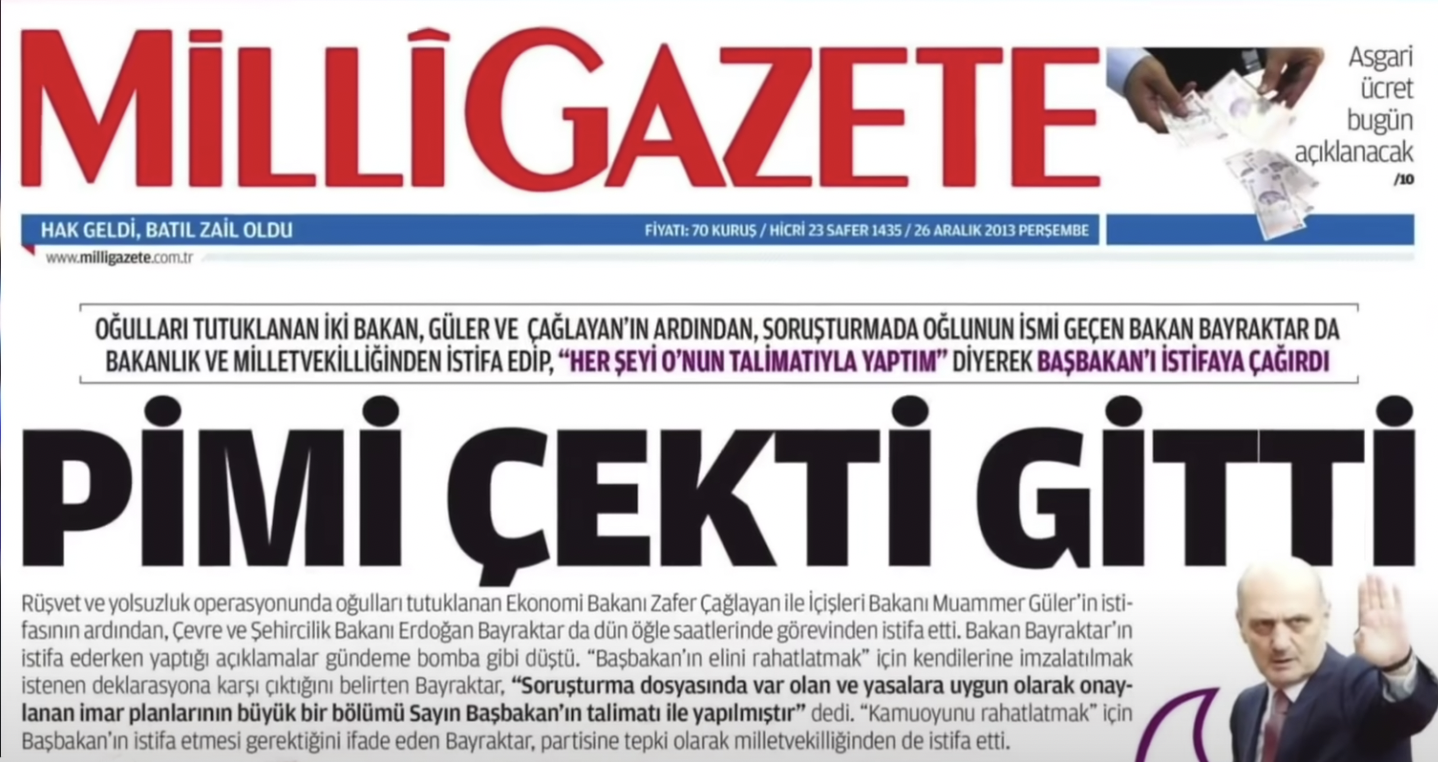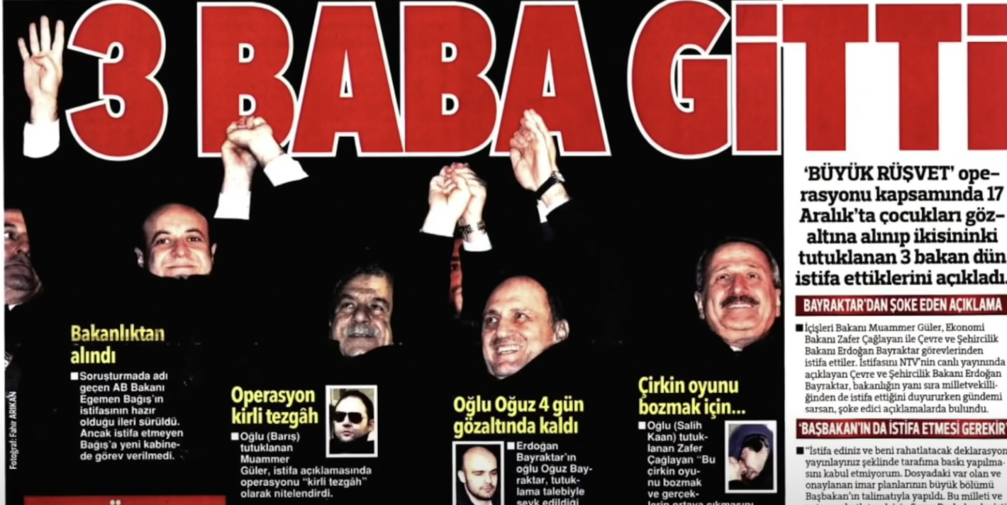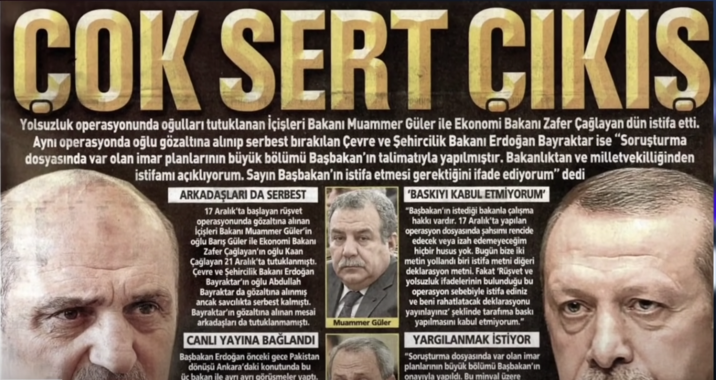 17-25 Aralık soruşturmaları ile ilgili „Dosyamda ne varsa doğrudur“ diyen Eski Çevre ve Şehircilik Bakanı Erdoğan Bayraktar yeni açıklamalar yaptı. 17-25 yolsuzluk operasyonu hakkında yine ama bu sefer Firat Bila´ya konuşan Erdoğan Bayraktar: “8 yıldır boğazımda bir düğüm var. Ne içersem içeyim bunu yutamıyorum, sindiremiyorum. Gazoz içiyorum olmuyor, soda içiyorum olmuyor..” Öbür tarafdan Eski Şehircilik ve Çevre Bakanı Erdoğan Bayraktar’ın TOKİ arazilerini vakfına devredip inşaat yaptığı öne sürüldü.