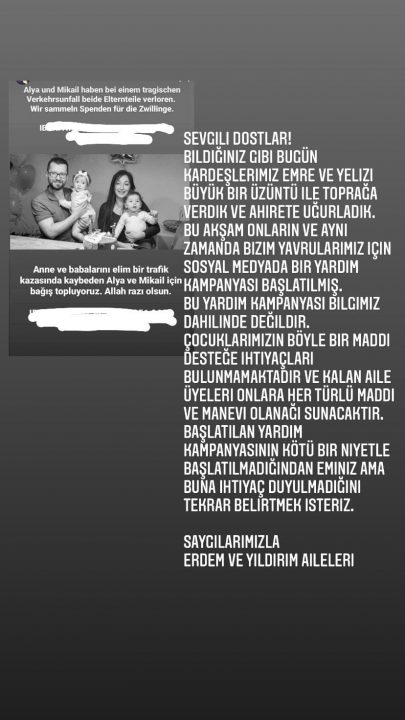 “Sevgili Viyanalı meslektaşımız Yeliz Erdem (34 yaşında) ve eşi Emre Erdem’in (35 yaşında) 5 Ocak 2021’de ölümcül bir kaza geçirdiğini duyurmak bizi üzüyor. Arkalarında bir yaşında ikiz çocuk bırakıyorlar. Şimdi çocukları desteklemek için bir bağış hesabı oluşturduk.