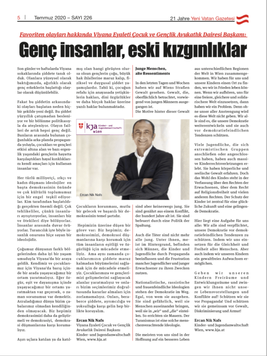 Viyana Eyaleti ve Belediyesi´nin önemli bir kurumu olan "Kinder- und Jugendanwaltschaft Wien" (Viyana Çocuk ve Gençlik Avukatlık Dairesi) Başkanı Ercan Nik Nafs Yeni Vatan Gazetesi'nin geçtiğimiz hafta Favoriten'den vuku bulan ve Avusturya basınında geniş yer verilen olaylar konusunda sorularımıza bir analiz şöyle cevap verdi.
