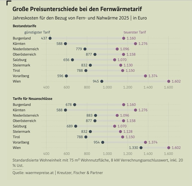 Analize göre, mevcut tarifelerdeki maliyetler Burgenland’da yıllık 437 avro ile Viyana’da 1602 avro arasında değişmektedir (ancak Wien Energie, Kelag’ın Viyana’daki merkezi gaz kazanlı ısıtma sistemleri için belirlediği fiyatlar olduğunu belirtmektedir) – bu, neredeyse yüzde 270’lik bir fiyat farkı anlamına gelmektedir.