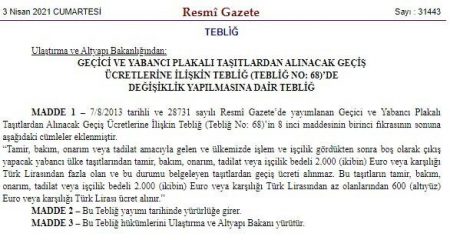 “Tamir, bakım, onarım veya tadilat amacıyla gelen ve ülkemizde işlem ve işçilik gördükten sonra boş olarak çıkış yapacak yabancı ülke taşıtlarından tamir, bakım, onarım, tadilat veya işçilik bedeli 2.000 (ikibin) Euro veya karşılığı Türk Lirasından fazla olan ve bu durumu belgeleyen taşıtlardan geçiş ücreti alınmaz. Bu taşıtların tamir, bakım, onarım, tadilat veya işçilik bedeli 2.000 (ikibin) Euro veya karşılığı Türk Lirasından az olanlarından 600 (altıyüz) Euro veya karşılığı Türk Lirası ücret alınır.”