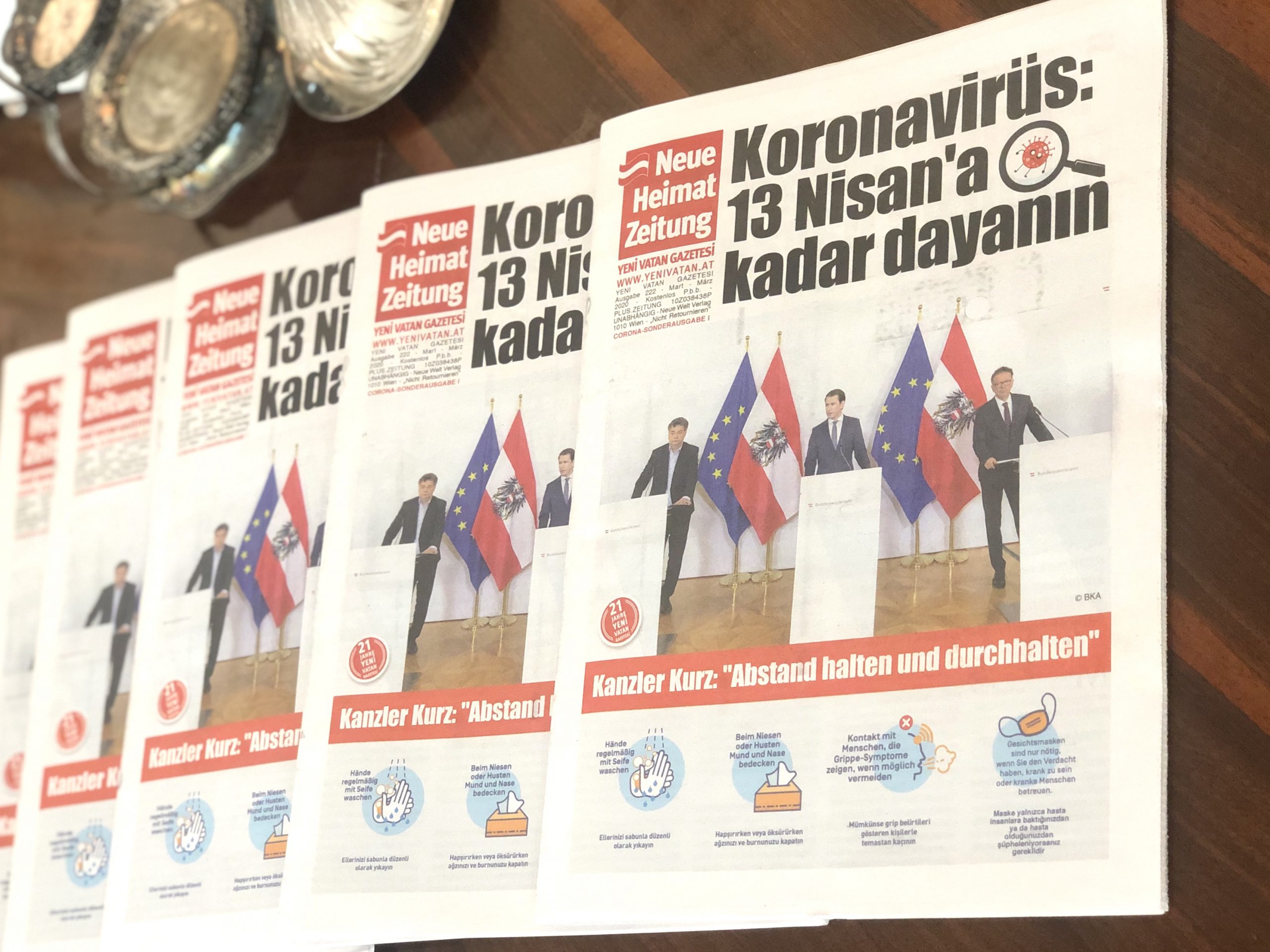 Wien . Mit folgendem Motto hat die österreichische Zeitung in türkischer Sprache Neue Heimat Zeitung die Coronavirus Sonderausgabe II Ende März herausgegeben: “Evde kalın, mesafeli olun ve dayanın auf deutsch „zu Hause bleiben, Abstand halten und durchhalten“. Mehr Menschen sollten sich wegen des Corona Virus freiwillig in Quarantäne begeben. Verlasse dein Zuhause nicht, wenn es nicht unbedingt notwendig ist. Wir sitzen alle im selben Boot, müssen zusammenhalten und uns mit allen Teilen der Gesellschaft solidarisieren. Leider verbreiten sich jeden Tag Fake News unglaublich schnell und nicht nur auf Deutsch, sondern auch Türkisch. Für uns ist es wichtig, alle in Österreich lebende Menschen die aus der Türkei stammen vielseitig und reichhaltig über das Coronavirus aufzuklären. Es geht um unser Land Republik Österreich in dem wir gemeinsam in Frieden, Freiheit und Loyalität in Zukunft zusammenleben wollen.“