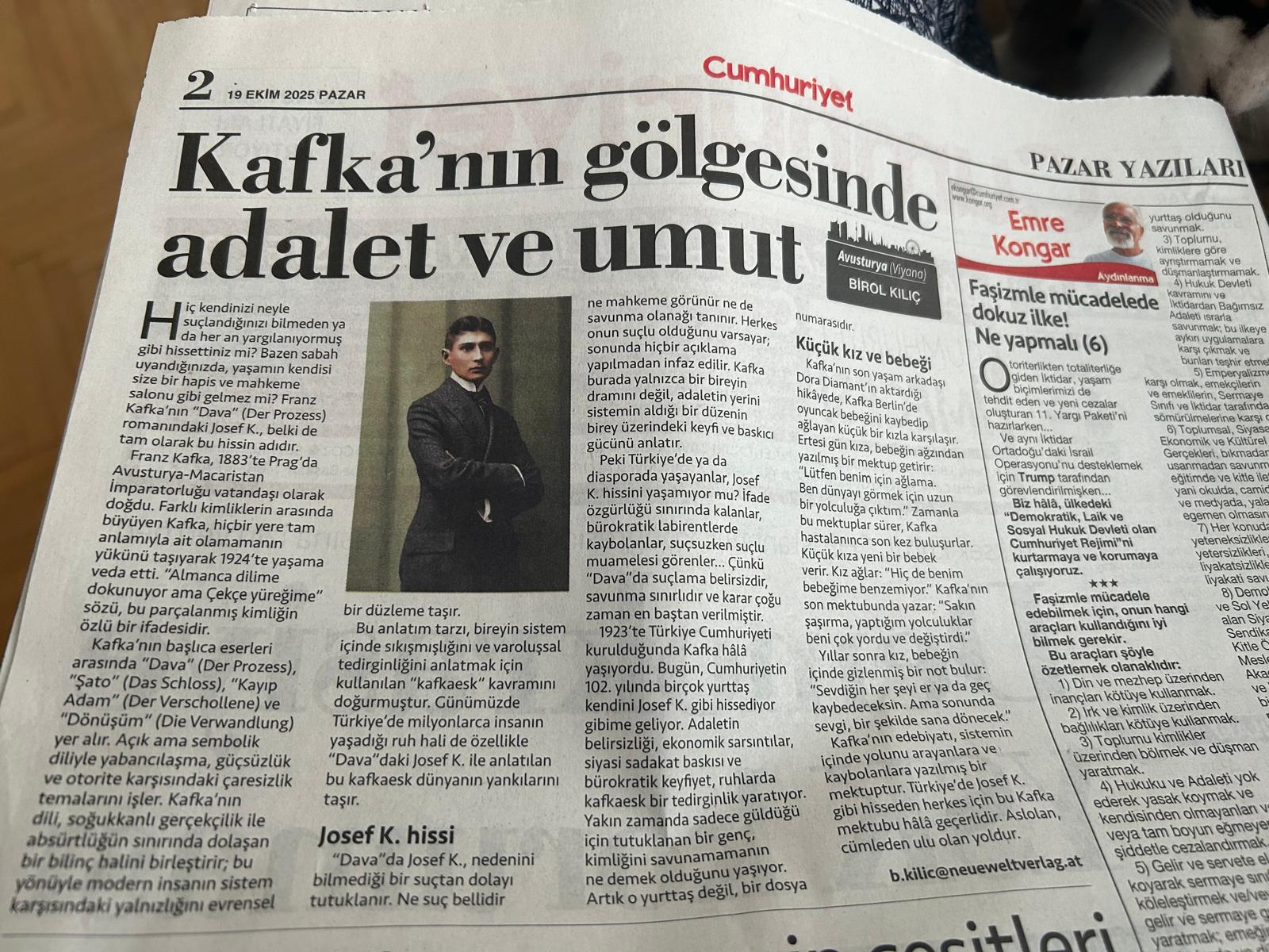Die traditionsreiche türkische Qualitätszeitung Cumhuriyet („Die Republik“) – die älteste noch erscheinende Zeitung der Türkei – veröffentlichte am 19. Oktober 2025 auf Seite zwei ihrer Rubrik für prominente Autoren einen Essay von Birol Kılıç aus Wien mit dem Titel „Gerechtigkeit und Hoffnung im Schatten Kafkas“. Wir haben den Beitrag ins Deutsche und Englische übersetzt.