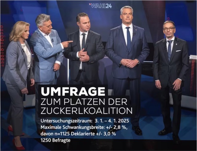 Demoskopi ve Veri Analizi Enstitüsü’nden (IFDD) Christoph Haselmayer, NEOS’un çekilmesi nedeniyle “Şeker koalisyonun patlaması ya da parçalanmasının hemen ardından ’Krone” gazetesi için temsili bir anlık anket başlattı. Örneklem 1250 kişi, dalgalanma marjı yüzde 2,8. Bir anahtar soru: Son olaylardan sonra kime oy verirdiniz? Haselmayer, „FPÖ’nün yüzde 37 ile zirvede istikrarlı olduğunu, alt sınırın 34, “potansiyelin ise 40’a kadar çıkabileceğini” dedi.