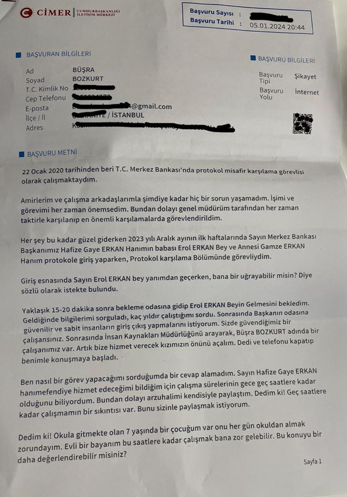 Merkez Bankası başkanlık katında dört yıldır protokol görevlisi olarak çalıştığını belirten Büşra Bozkurt, CİMER’e verdiği dilekçede, “Sayın Başkanımız Hafize Gaye Erkan Hanım’ın babası Erol Erkan Bey ve annesi Gamze Hanım protokole giriş yaparken, Erol Bey yanımdan geçerken, ‘bana bir uğrayabilir misin?’ dedi. Uğradım, ‘Başkanın odasına güvenilir ve sabit insanların giriş çıkış yapmalarını istiyorum. Siz de güvendiğimiz bir çalışansınız’ dedi. Sonra insan kaynaklarını arayarak benim artık kendilerine hizmet vereceğimi söyledi” dedi.