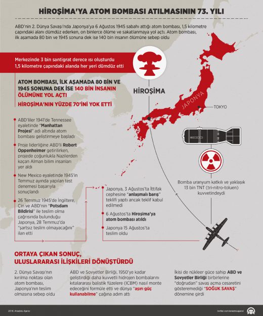 ABD’nin 2. Dünya Savaşı’nın Pasifik Muharebeleri esnasında, Japonya’nın Hiroşima şehrine 6 Ağustos 1945 sabahı attığı atom bombası on binlerce insanın ölümüne ve sakatlanmasına sebep oldu.Hiroşima’nın yüzde 70’ini yok eden uranyum katkılı ve yaklaşık 13 bin TNT (tri-nitro-toluen) kuvvetindeki bomba, merkezinde 3 bin santigrat derece ısı oluştururken, 1,5 kilometre çapındaki alanda her yeri dümdüz etti. Atom bombası, ilk aşamada 80 bin ve 1945 sonuna dek ise 140 bin insanın ölümüne yol açtı.