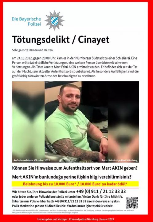 Nürnberg. Uluslararası Polis Teşkilatı (INTERPOL) geçtiğimiz Ekim ayında Nürnberg’de bir kişinin öldüğü bir kişinin ise ağır yaralandığı silahlı saldırının faili olduğu düşünülen Türk Mert Fahri Akın için kırmızı bülten çıkarttı.