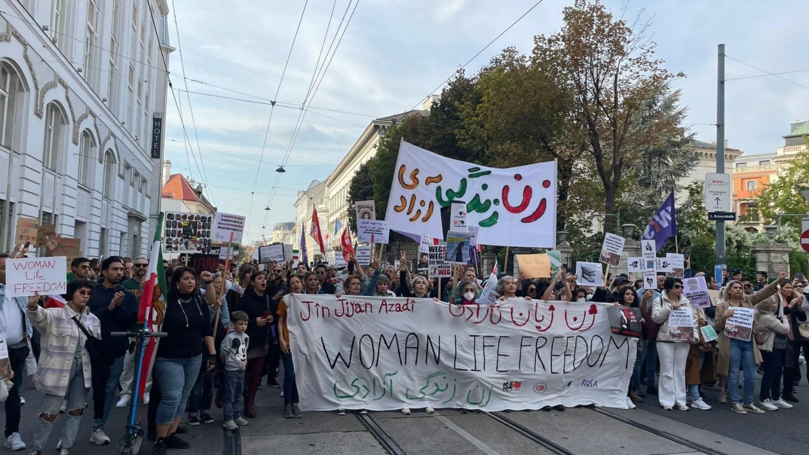 Kurier’in verdiği habere göre Berlin, İstanbul, New York ve Barselona gibi şehirlerin yanı sıra, cumartesi öğleden sonra Viyana’da da insanlar sokaklara döküldü. Organizatörlere göre, kadınların yanı sıra çocuklar ve erkekler olmak üzere yaklaşık 5.000’den fazla kişi, Karlskirche’den Schweizer Garten’a yürüdü. İslam Cumhuriyeti’nin sonunun gelmesini isteyen protestocular, eylem sırasında „Her türlü baskıya karşı“, „Kardeşim için, kız kardeşin için, bizim kız kardeşimiz için“, „Kadın hakları her yerde, kadın hakları İran’da“ yazılı pankartlar taşıdı.