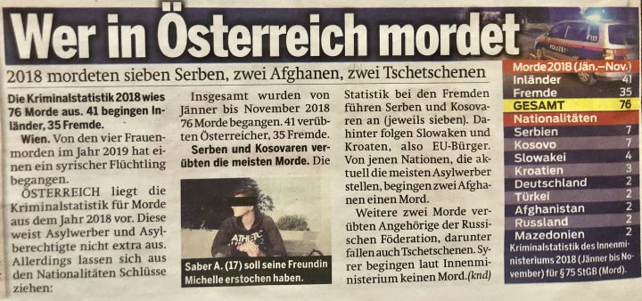 Avusturya suç istatistiklerine göre 2018 yılında, 41’i Avusturyalılar, 35’i yabancılar tarafından olmak üzere toplam 76 cinayet işlendi.