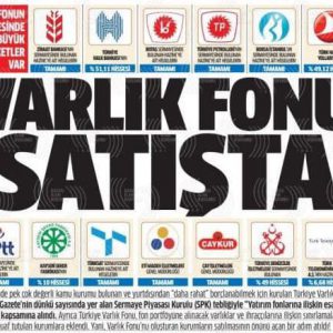 Bünyesinde pek çok değerli kamu kurumu bulunan ve yurtdışından “daha rahat” borçlanabilmek için kurulan Türkiye Varlık Fonu, Resmi Gazete’nin dünkü sayısında yer alan Sermaye Piyasası Kurulu (SPK) tebliğiyle “Yatırım fonlarına ilişkin esaslar tebliği” kapsamına alındı. Ayrıca Türkiye Varlık Fonu, fon portföyüne alınacak varlıklar ve ihraççılarına ilişkin sınırlamalardan muaf tutulan kurumlara eklendi. Yani, Varlık Fonu’nu oluşturan kurumların satılmasının önünü açan bir adım atıldı!