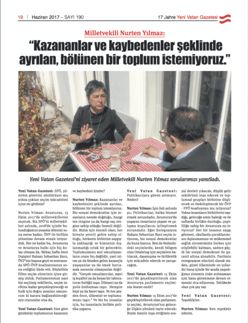 Nurten Yılmaz: 15 Ekim 2017’de geçekleştirilecek olan parlamento seçimi, Avusturya’nın geleceğe ilişkin yönünü tayin edecek: Bizim özenle inşa ettiğimiz sosyal devleti yıkacak, düşük gelir sektörünü inşa edecek ve toplumsal grupları birbirine düşürecek ve ötekileştirecek bir ÖVP – FPÖ koalisyonu mu istiyoruz? Yoksa insanların birbirlerini saydığı, geleceğe emin baktığı ve ön saflarda birlikte durduğu, çeşitliliğe sahip bir Avusturya mı istiyoruz? Her bir insanın saygı görmesi, okullarda çocuklarımızın dışlanmaması ve mükemmel sağlık sistemimizin herkes için erişilebilir kalması, sadece güçlü bir sosyal demokrasi ile garanti altına alınabilir. Partimin entegrasyon sözcüsü olarak sizden, güzel ülkemizde on yıllardır barış içinde bir arada yaşadığımız sistemin riske atılmaması için bana güvenmeye devam etmenizi rica ediyorum. Tehlikede olan çok şey var.