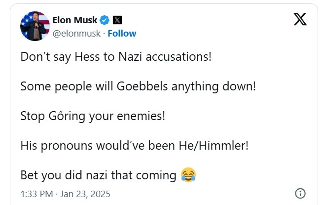 Viyana. Teknoloji milyarderi Musk, bazı kelimeleri Adolf Hitler ile birlikte milyonlarca Yahudi’nin zulüm ve cinayetini organize eden ve yürüten etkili Nasyonal Sosyalistlerin isimleriyle değiştirdiği bir dizi cümle yayınladı: Rudolf Hess, Joseph Goebbels, Heinrich Himmler ve Hermann Göring.