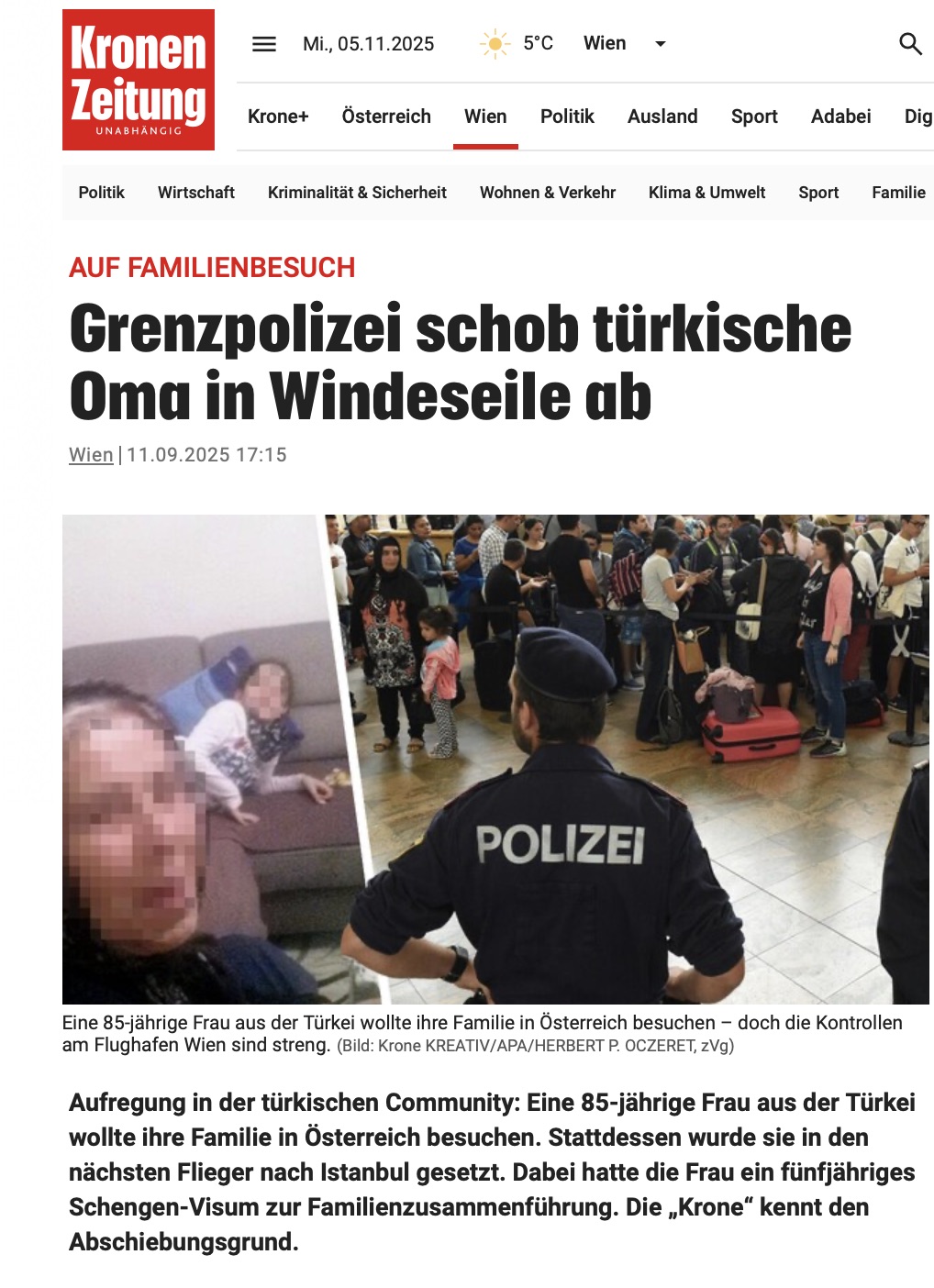Bundan yaklaşık iki ay önce, 7 Eylül 2025 tarihinde, gözleri görmeyen ve ayakları tutmayan, aile birleşimi kapsamında Viyana’da süresiz Schengen vizesi bulunan 85 yaşındaki Türk vatandaşı bir kadına Viyana Havalimanı’nda adeta işkence yapılarak karga tulumba ilk uçakla geri gönderildi. Yeni Vatan Gazetesi bu gelişmeleri, “ Geri gönderilme gerekçesi, Türkiye’de en fazla 12 ay kalması gerekirken 15 ay kalmış olmasıydı. Bu nedenle yaşlı kadının süresiz oturma izni tamamen iptal edildi. Şu anda yeniden vize alabilmek için uğraşıyor ve ailesi onu Viyana’da bekliyor.“ diye verip haberin detaylarını hem Almanca hem de Türkçe diline dile getirmiş ve Krone Gazetesi buradan Almanca haber yapmıştı.