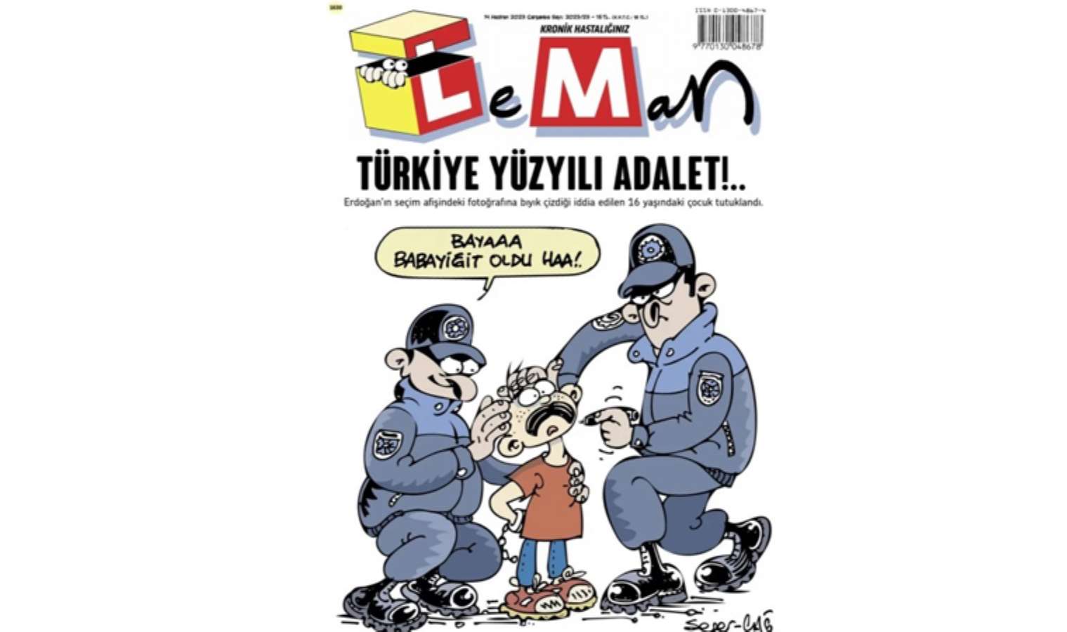 Karikatür dergisi LeMan, AKP’li Cumhurbaşkanı Erdoğan’ın seçim afişindeki fotoğrafına bıyık çizdiği için tutuklanan çocuğu kapağına taşıdı. Kapak, sosyal medyada da gündem oldu.