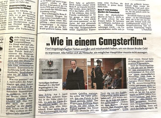 Linz'de gangster ve Kurtlar Vadisi filmlerinde geçen sahneleri aratmayacak mafyatik adam kaçırma davası başladı. 4 Suriye ve bir Almandan oluşan beş sanığın, Türk asıllı bir adamı arabayla kaçırıp taciz ettiği, dövdüğü, işkence yaptığı ve kardeşinden 175.000 Euro gasp ettiği iddia edildi. Kurtarma Viyana'daki bir tanık sayesinde başarılı oldu.