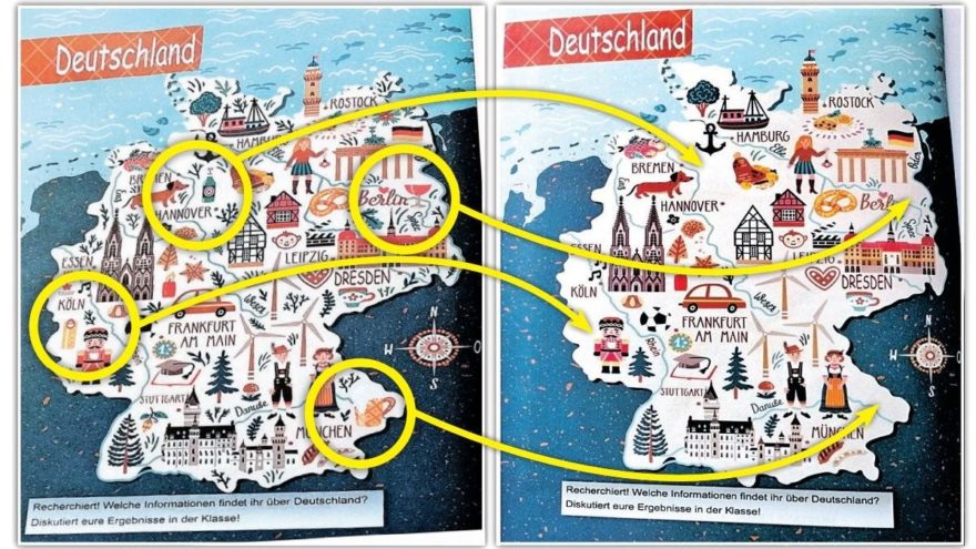 Kitabın giriş kısmında yer alan ve altında “Araştırın… Almanya hakkında hangi bilgileri buldunuz? Sonuçları sınıfta tartışınız” yazısı bulunan haritada, Almanya hakkında bazı bilgiler resimlerle sembolize edildi. Ancak bu yıl dağıtılan yeni baskı kitaplarda iki yıl önce dağıtılanlarda olan bazı sembollerin kaldırıldığı görüldü. Münih kenti yazısının üzerindeki bira bardağı, Hamburg ile Hannover arasında görülen bira şişesi, Berlin üzerindeki kadeh resmi ve Bira Festivali görseli artık yok.