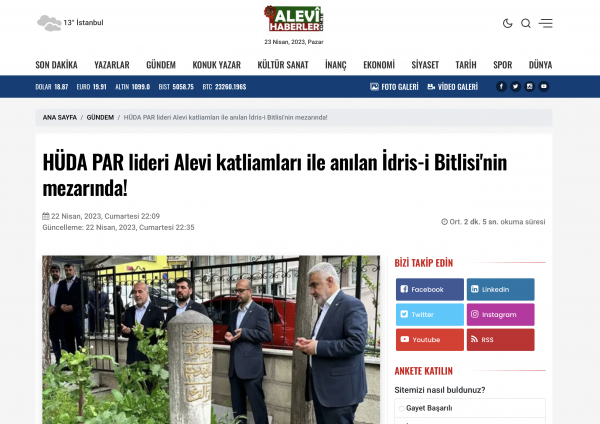 İSTANBUL. Alevihaberler sitesinin verdiği habere göre, „İstanbul’da Ayasofya Camisinde bayram namazı kılan HÜDA PAR lideri ve AK Parti İstanbul Milletvekili Adayı Zekeriya Yapıcıoğlu, adı Yavuz Sultan Selim döneminde Doğu Anadolu’daki Kürt aşiretlerini Alevilere yönelik katliamlara yönlendirmekle anılan İdris-i Bitlisi’nin Eyüp ilçesindeki mezarını ziyaret etti.“