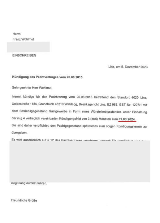 „Kaiser Franz“ işletmecisi Wohlmuth Franz ise bu iddiaya karşılık „Söze gerek yok“ diyerek kira sözleşmesinin feshine dair kendisine gönderilen ihbarnameyi paylaştı.