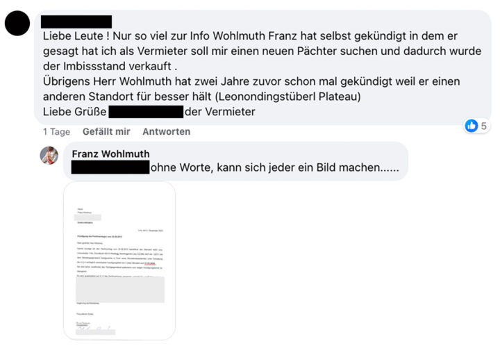 Mülk sahibi ise satış sürecinin arka planına dair Facebook’tan yaptığı açıklamada, „Bilginiz olsun diye söylüyorum: Wohlmuth Franz, mülk sahibi olarak yeni bir kiracı aramam gerektiğini söyleyerek sözleşmeyi kendisi iptal etti ve sonuç olarak atıştırmalık standı satıldı“ iddiasında bulundu.