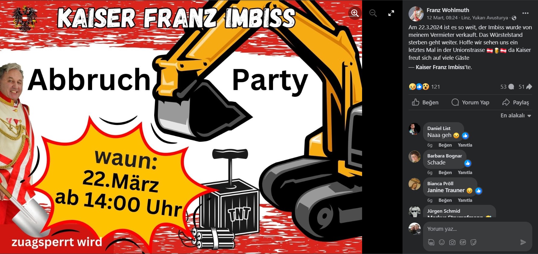 „Sosis standının ölümü devam ediyor. Unionstrasse’de son bir kez daha görüşmek dileğiyle“. Wohlmuth 22 Mart’taki „yıkım partisini“ Facebook arkadaşlarına ve müdavimlerine böyle duyurdu. Bu haber Linz şehir sınırlarının çok ötesinde üzüntüye neden oldu.