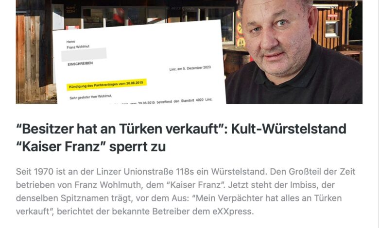 „Linz’de 1970 yılından beri faaliyet gösteren ünlü sosis standı „Kaiser Franz“ kapandı. Uzun süredir standın işletmeciliğini sürdüren Franz Wohlmuth eXXpress’e yaptığı açıklamada, „Mülk sahibi her şeyi Türklere sattı“ dedi.
