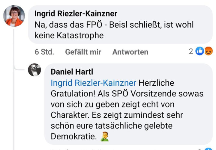 „Kaiser Franz“ın işletmecisi Wohlmuth Franz’ın Facebook’tan yaptığı paylaşımın altına gelen yorumlar da oldukça dikkat çekti. Salzburg Eyalet Parlamentosu’nun eski üyesi ve Radstadt SPÖ’nün şu anki yerel parti lideri Ingrid Riezler-Kainzner, Facebook’taki haberin altına yaptığı yorumda şunları söyledi: „FPÖ lokalinin kapatılması muhtemelen bir felaket değildir.“
