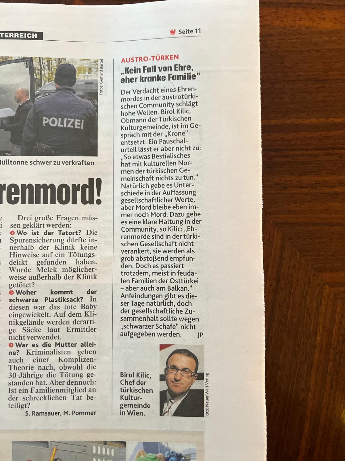 Viyana. 10. Viyana Favoriten ilçesi kliniğinde prematüre bebeğini öldürdüğü iddia edilen ve polise itirafta bulunan annenin tutuklanmasının ardından akıllarda pek çok soru kaldı. Annenin öne sürdüğü “ailevi nedenler” – artık bilindiği üzere – aşırı uçlardaydı. Melek bebeği özellikle baba tarafının ailesi istemiyordu. Bu olayın Avusturya basınında bazı mecralarda “namus davası” olarak lanse edilmesine istinaden Krone Gazetesi, yayınevi sahibi ve kısa adı TKG olan Avusturya Türk Kültür Cemiyeti Başkanı Birol Kılıç’a kısa olarak ama önemli sayılan söz hakkı vererek verdi.