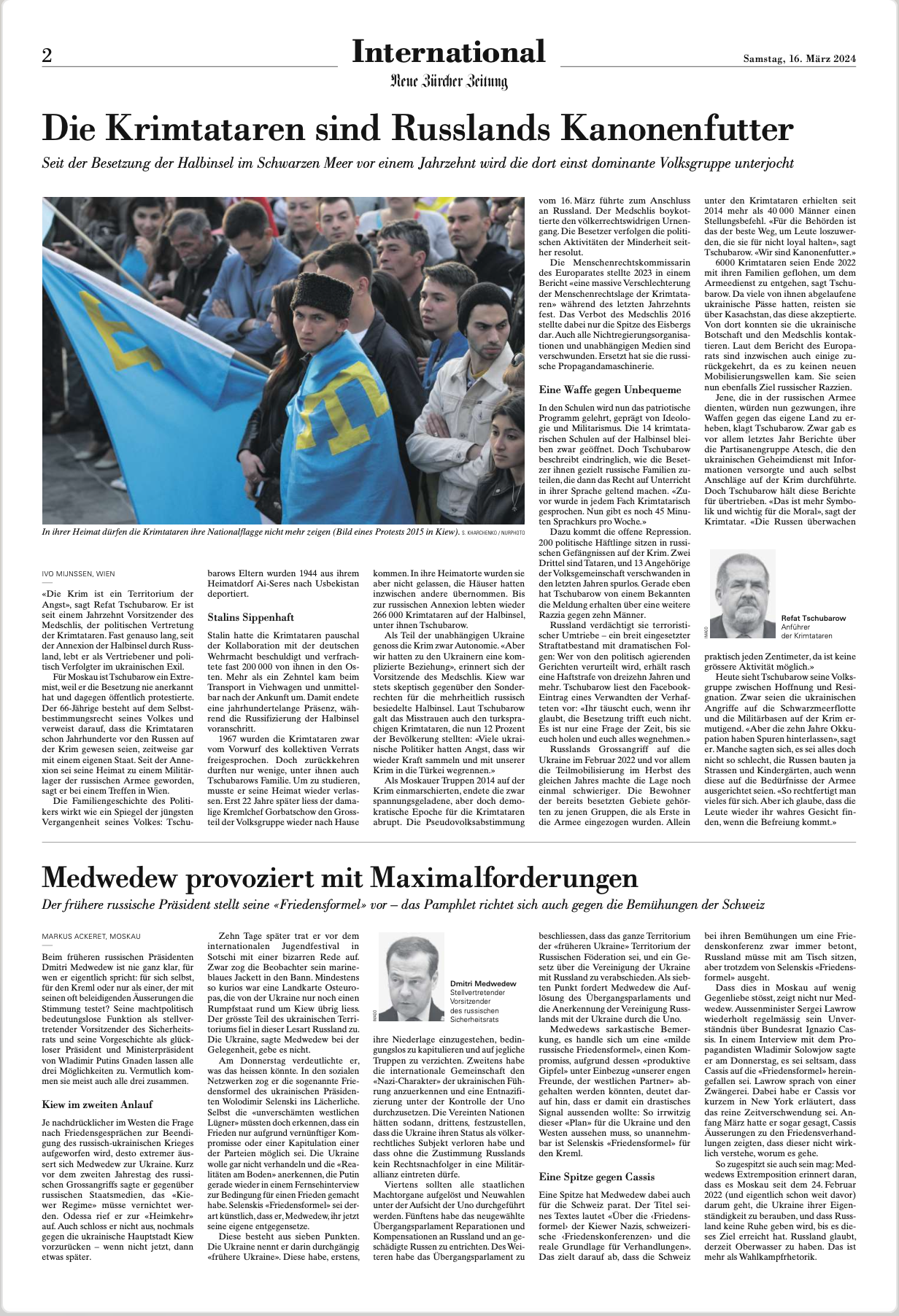 Başlığı , "Kırım Tatarları Rusya'nın savaşta kullandığı top mermileri" şeklinde tercüme edilecek mülakat, Neue Zürcher Zeitung'ın hem İsviçre sayılarında hem de uluslararası yayınlarında 16.Mart.2024 tarihinde yayınlandı.