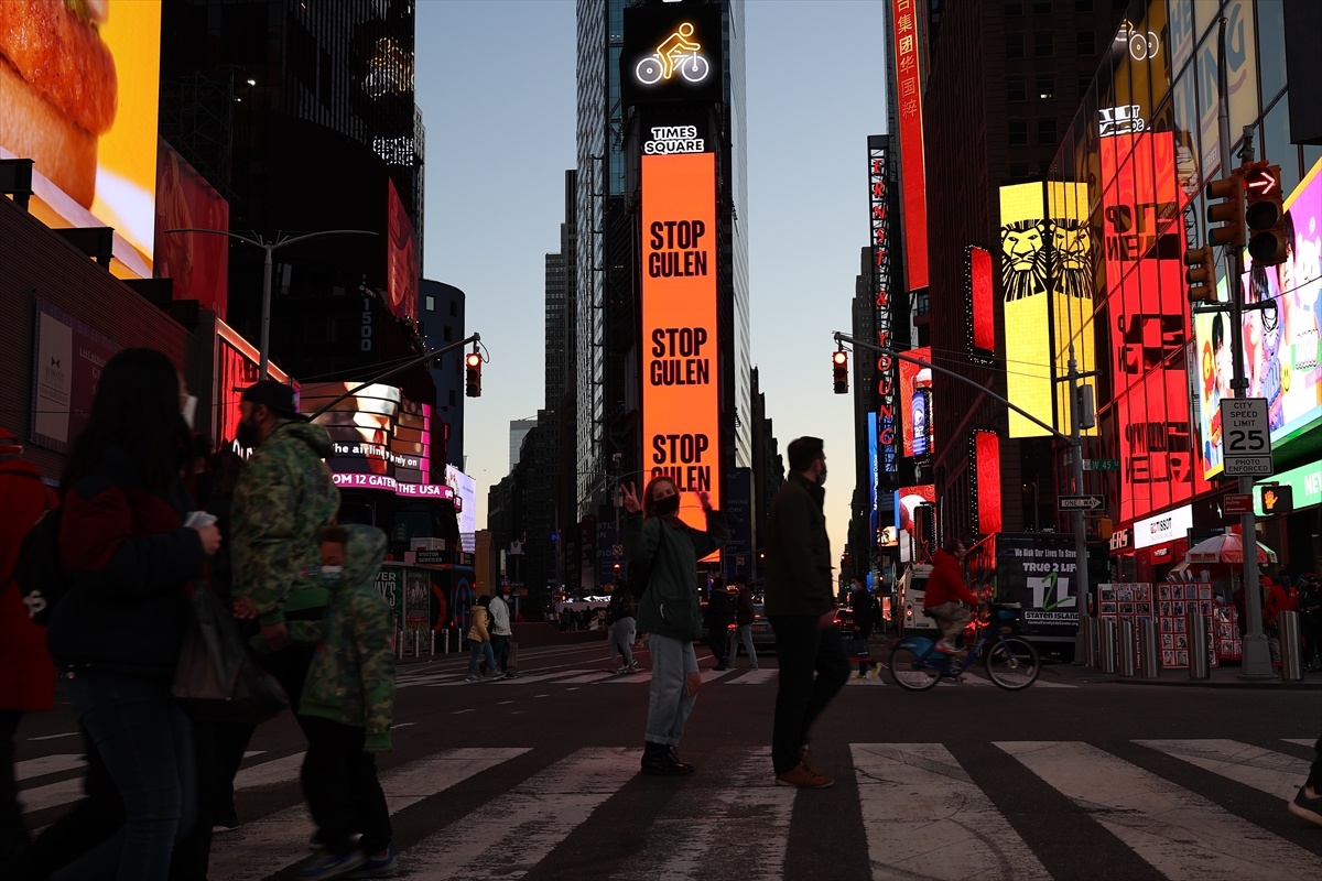 Şehrin en kalabalık mekanı Times Meydanı’nda bulunan dijital dev ekranda yayınlanan ilanda „Pensilvania’da yaşıyor. 251 masum insanı katletti. Gülen’i durdurun“ şeklinde ifadelerin yer aldığı gözlendi.