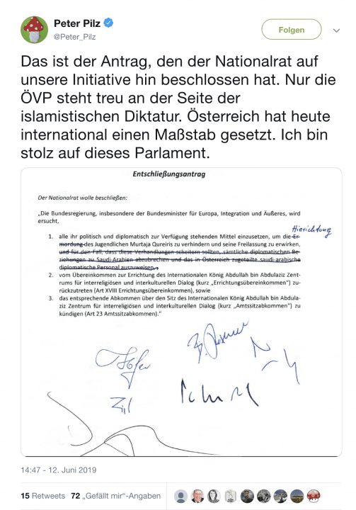 Der nächste Schritt sei nun die Schließung der saudischen Botschaft, sagt Pilz und spricht von einem internationalen Signal: „Das kommt sicher auch in Riad an.“
