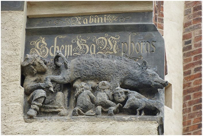 An der südlichen Außenfassade der Stadtkirche zu Wittenbberg, die als Mutterkirche der Reformation gilt, ist eine sogenannte „Judensau“ zu sehen. Das Spottrelief zeigt einen Rabbiner, der einem Schwein unter den Schwanz schaut. Mehrere Juden saugen zudem an den Zitzen des Tieres. Das Bild ist ein bösartiger Angriff auf die Juden und ihren Glauben. 1988 wurde im Auftrag der Stadtkirchengemeinde unterhalb der Darstellung eine Gedenkplatte in den Boden eingelassen. Sie soll auf die historischen Folgen des Judenhasses aufmerksam machen. Wissenschaftler unterscheiden zwischen dem religiös motivierten Judenhass des Mittelalters und dem modernen, von einer biologischen Rassentheorie geprägten, Antisemitismus aus dem 19. Jahrhundert. Auf diesen konnten sich Nationalsozialisten und deutsche Christen berufen. Kein Zufall, dass ein Thüringer Landesbischof 1938 darauf hinwies, dass die Synagogen in der Nacht auf den 10. November, Luthers Geburtstag, brannten. Und Julius Streicher, Herausgeber der Hetzschrift „Der Stürmer“, versuchte sich bei den Nürnberger Prozessen damit zu rechtfertigten, dass an seiner Stelle auch Martin Luther vor dem Tribunal hätte stehen können. (2)