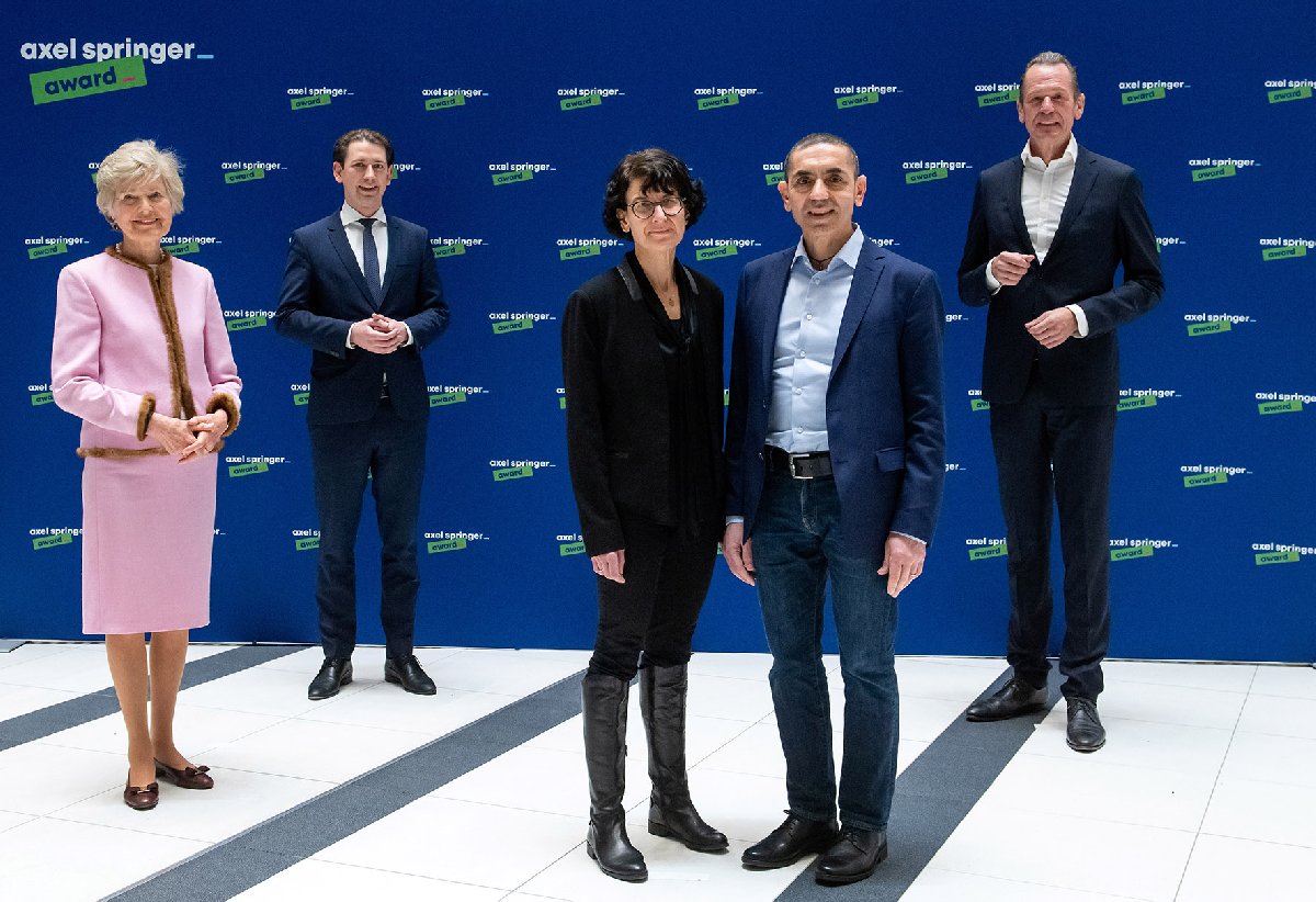 Soldan sağa: Axel Springer'in sahibi Friede Springer, Avusturya Başbakanı Sebastian Kurz, Özlem Türeci ile Uğur Şahin ve Axel Springer CEO’su Mathias Döpfner.