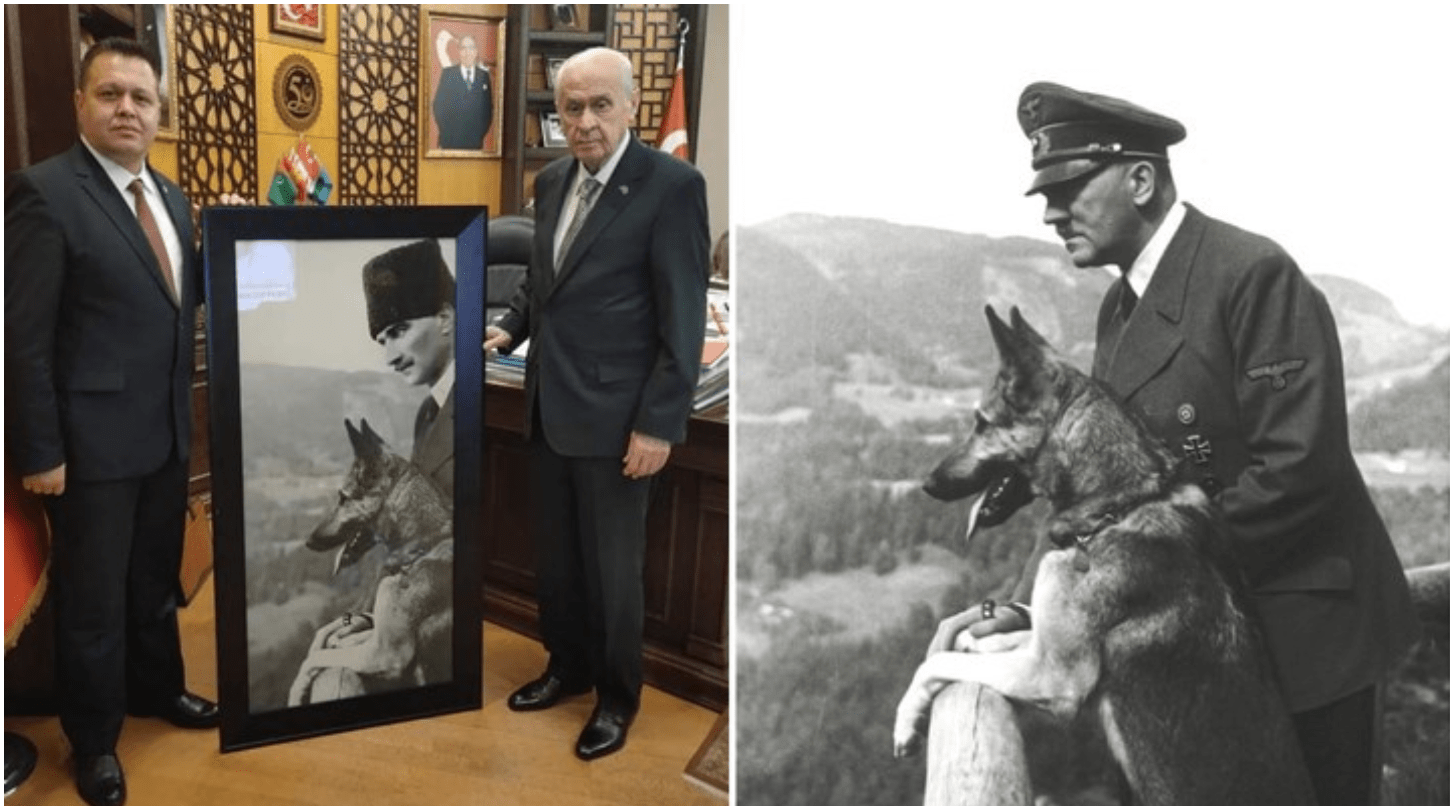 ANKARA. Devlet Bahçeli’nin Manisa İl Başkanlığına atadığı dünya tarihinen bir haber Cüneyt Tosuner, Bahçeli’ye Hitler’in ve “ BLONDİ“ adlı Alman kurt köpekli montajlı Atatürk posterini hediye etti. 20 Kasım 2022 tarihinde hayatını kaybeden Milliyetçi Hareket Partisi (MHP) Manisa İl Başkanı Murat Öner’in yerine Başkanvekili olarak görev yapan Cüneyt Tosuner atandı.
