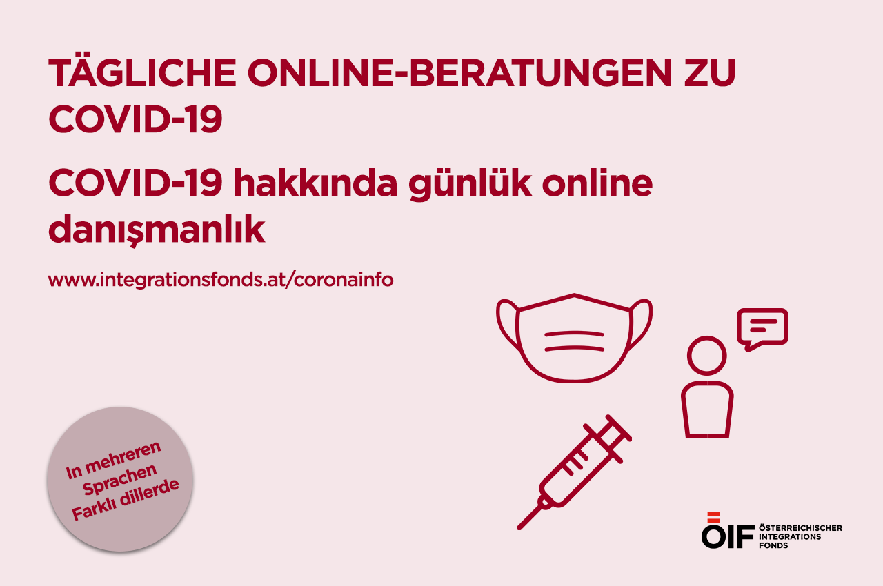 Bu ve diğer sorularınızı, korona virüs ile ilgili günlük kısa adı ÖIF Avusturya Entegrasyon Fonu’ndan Online Danışmanlıklarında yanıtlanmaktadır. 90 dakikalık Online Grup Danışmanlığında ÖIF, bir hastalığın belirtileri ve kendinizi ve başkalarını korumak için alabileceğiniz önlemler gibi temel bilgileri sağlar- YENI VATAN GAZETESİ iş birliği içinde Online Danışmanlık, 08 Şubat 2021’den itibaren tercümanlarla birlikte artık Türkçe olarak da sunulacak.
