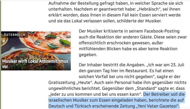 28.07.2025: Nach Antisemitismusvorwurf: Besitzer lädt Musiker laut Bericht zum Pizzaessen ein – DerStandard