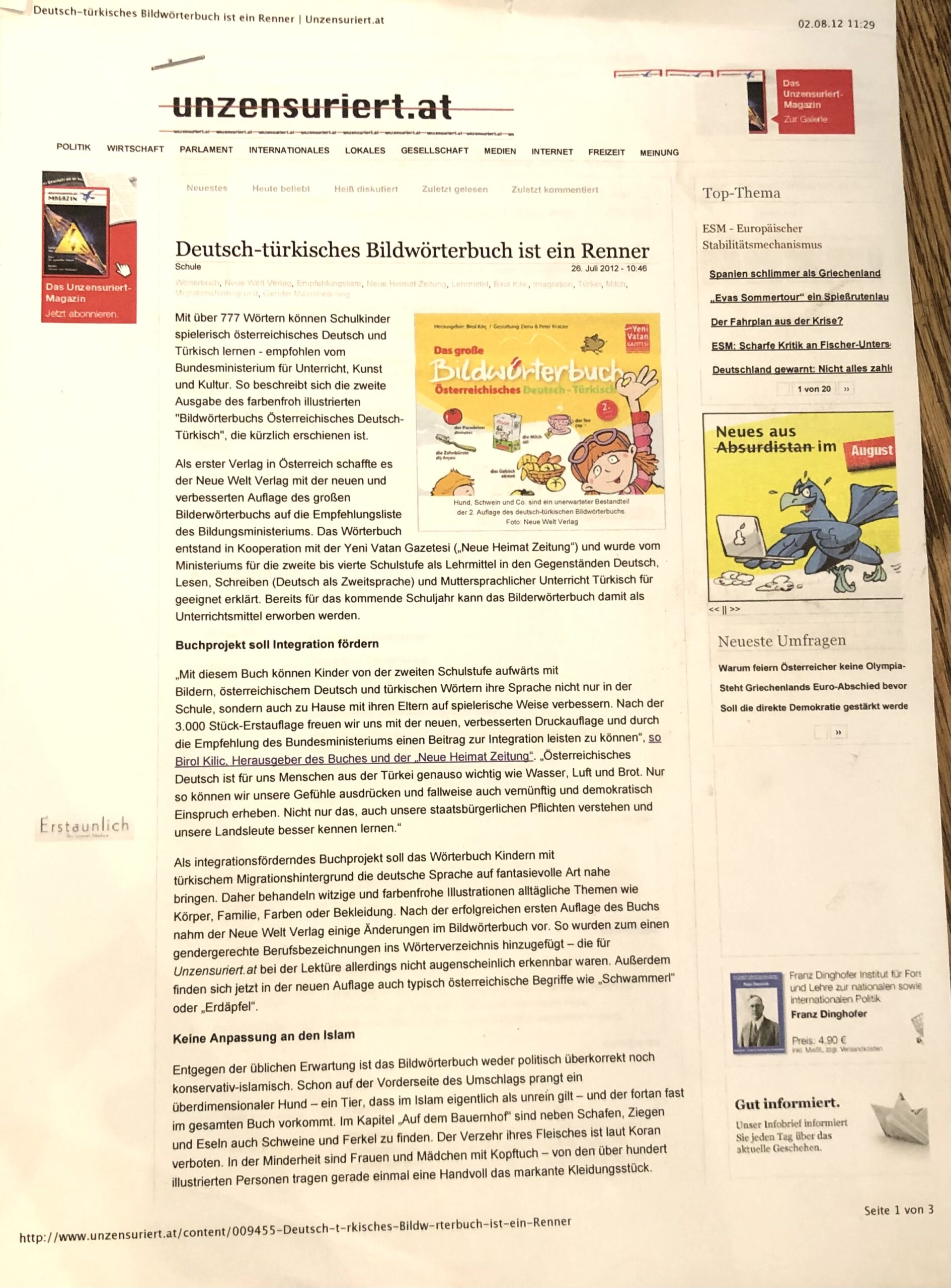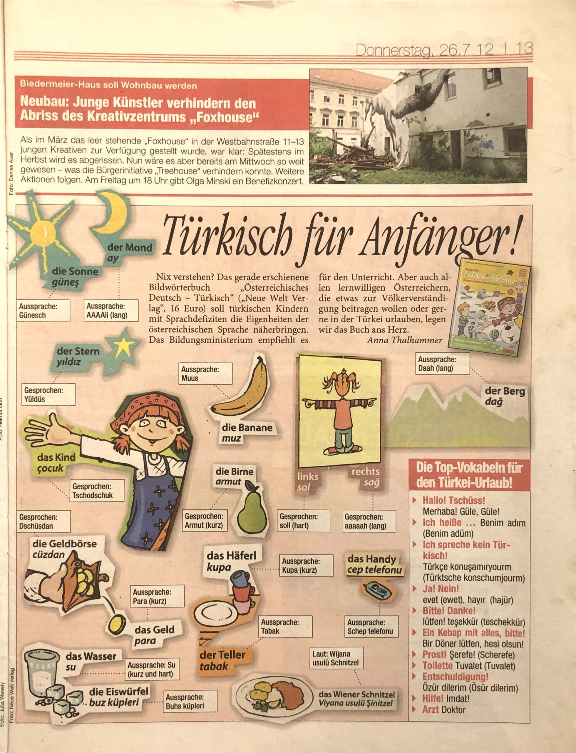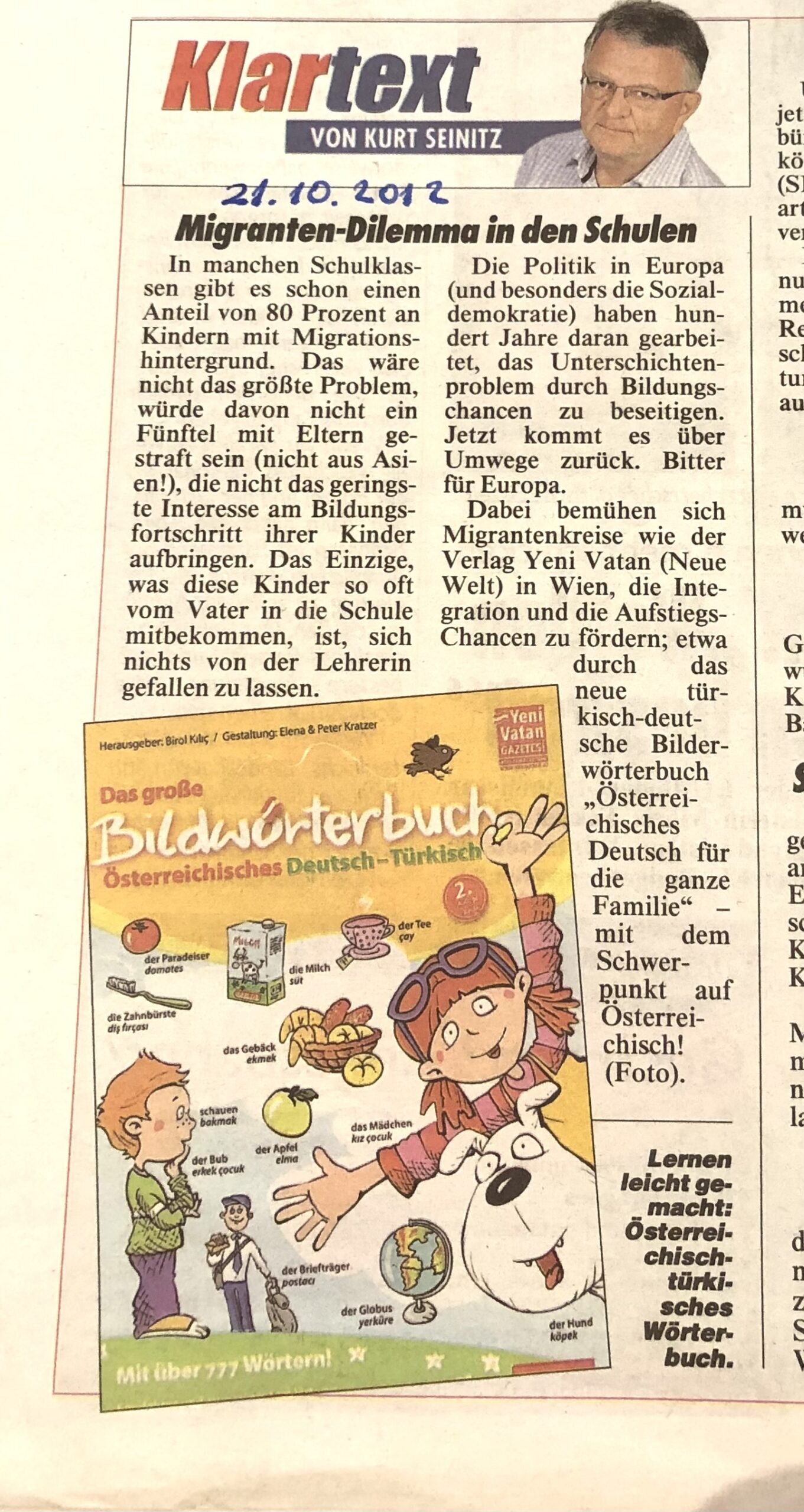„Knapp 800 Wörter enthält das erste Bildwörterbuch für österreichisches Deutsch und Türkisch. Mit seinen großformatigen Doppelseiten, den Lernspielen und witzigen Illustrationen ist es zwar primär für Kinder im Volksschulalter gedacht, findet aber auch großen Anklang bei Erwachsenen, weiß Verleger Birol Kilic zu berichten. So haben sich schon etliche Eltern und Großeltern, türkischer Abstammung bei ihm bedankt.“