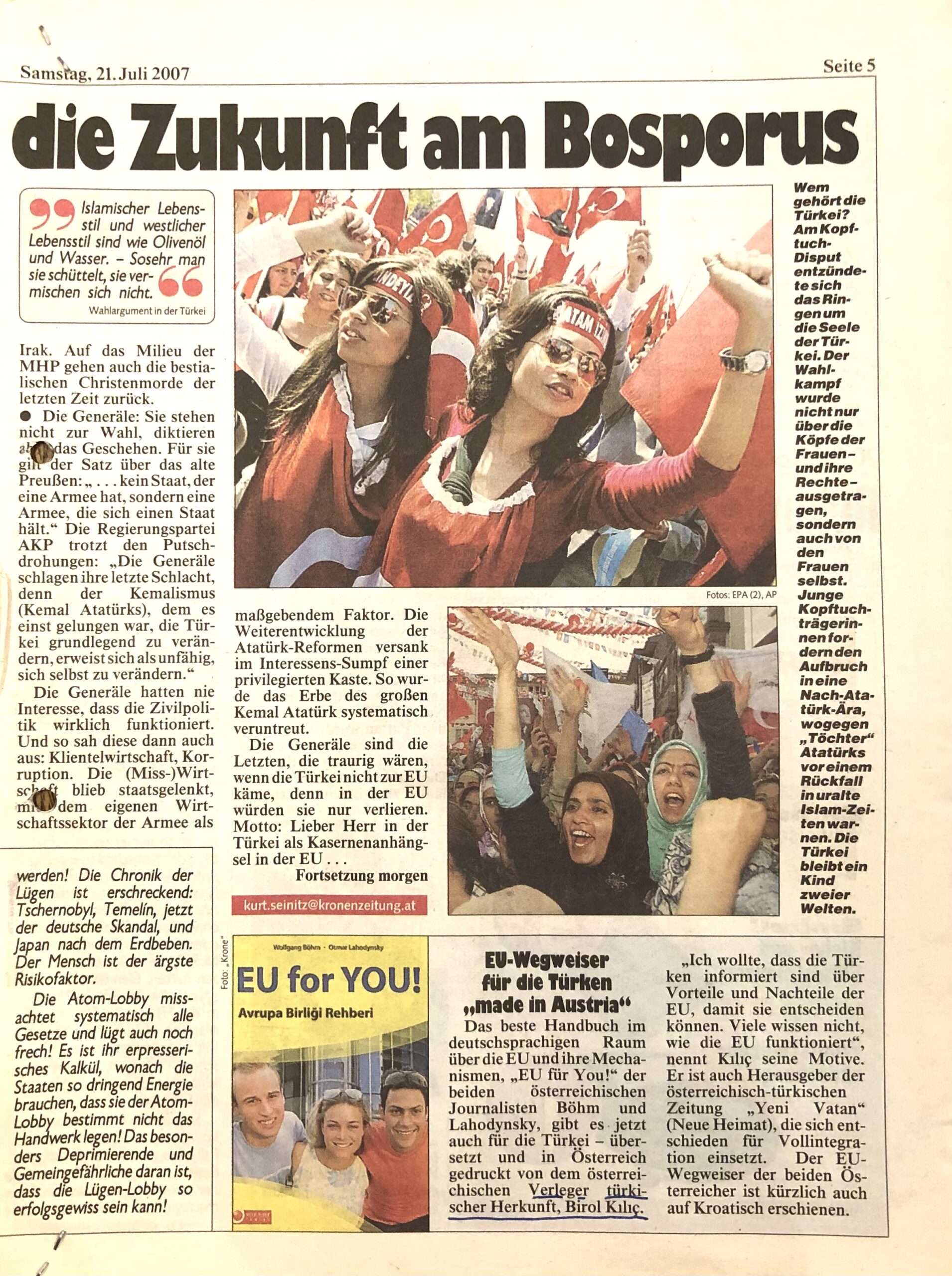 „Dem Chefredakteur der türkischsprachigen Zeitung in Österreich Yeni Vatan Gazetesi, Birol Kilic, bereitet die negative Stimmung gegenüber einem EU-Beitritt der Türkei Sorgen, vor allem wenn sie mit der aktuellen Islamophobie einhergeht.“