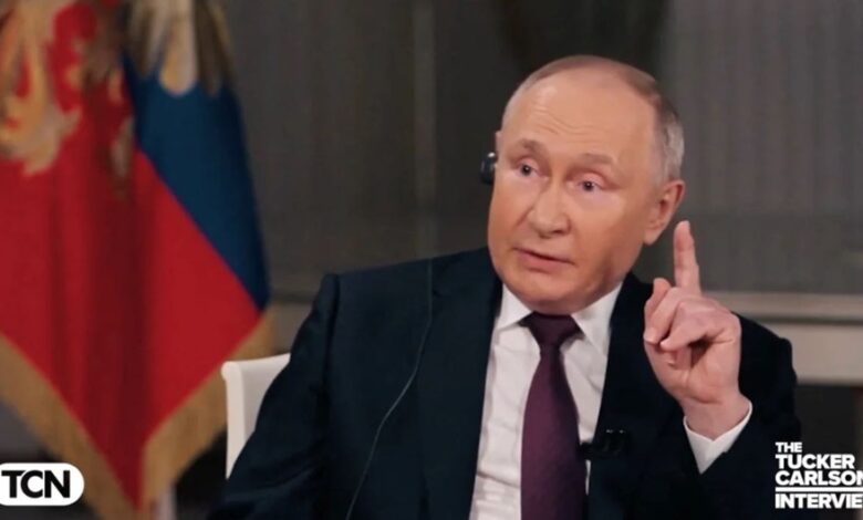 Moskova’da kaydedilen röportaj Carlson’ın web sitesinde ve eski adı Twitter olan X platformunda yayınlandı. Amerikan devlet politikasına aykırı görüşleri yüzünden Fox News’den ayrılan Tucker Carlson ile röportajında Putin, ilk yarım saatte üstü kapalı olarak ABD eğitim sistemini ve ABD’lilerin tarih bilgisini küçümseyerek Rusya’nın tarihini anlattı. Röportaj sırasında Rusya’nın Ukrayna’yı işgalini yine tarihi toprak iddialarıyla gerekçelendirdi ve NATO ile ABD’yi sert bir dille eleştirdi.