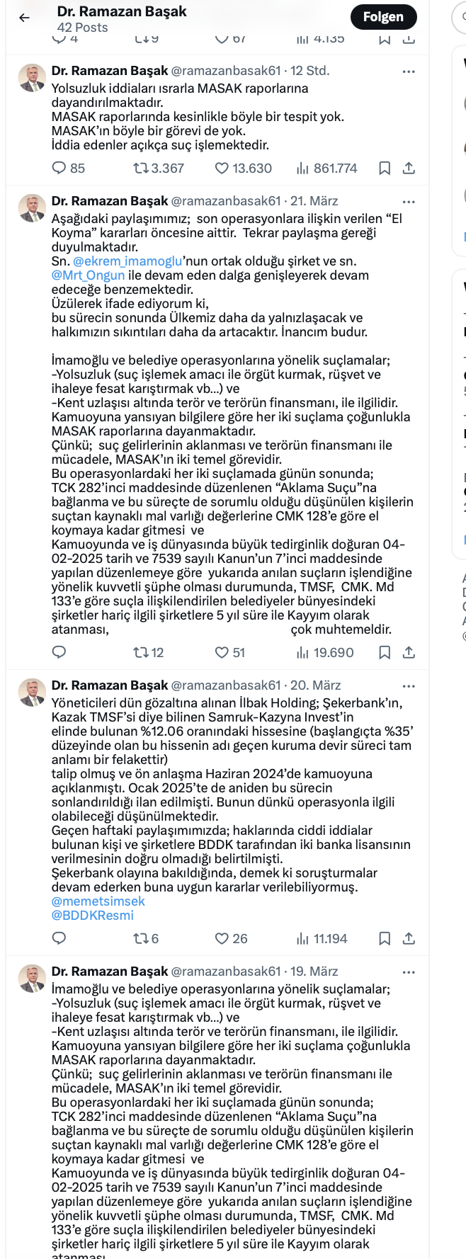 Eski MASAK Başkan Yardımcısı Ramazan Başak, İstanbul Belediye Başkanı Ekrem İmamoğlu’na yöneltilen suçlamalara gerekçe olarak öne sürülen MASAK raporları hakkında açıklama yaptı.