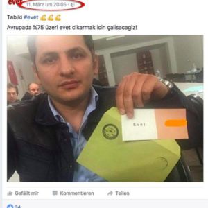 16 Nisan referandumunda Türk vatandaşlarının yurt dışındaki oy verme işlemi için skandal bir iddia ortaya atıldı. Daha oy verme işlemi resmen başlamadan, hatta pusulalar başkonsolosluklara ulaştırılmadan, Duisburg’daki AKP yöneticilerinden Ahmet Duran’ın mühürlü oy pusulası ile poz verdiği ortaya çıktı.