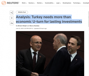 „Ekonomik reformlar ne olursa olsun, yatırımlar önemli ölçüde artmayacaktır“ dedi. ( Reuters, 12.06.2023, İstanbul)