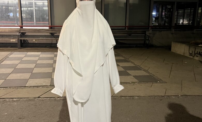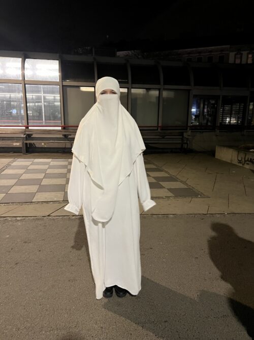 Bayan ile kısa Almanca konuşuyoruz. Sempatik pırıl pırıl bu genç kıza soruyoruz, „ Niye siyah değil beyaz giyindiniz ?“ Kendisinden izin alarak fotoğrafını çektik.