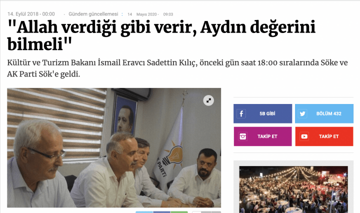 Türkiye’de 24 Haziran 2018’de Cumhurbaşkanlığı seçimleri yapıldı ve AK Parti Başkanı Erdoğan Cumhurbaşkanı seçildi. Bu seçimlerde Başbakan Müşaviri olan Sadettin Kılıç, şu haberlerden anlaşılacağı üzere seçimlerde oldukça aktif olarak çalışmış. Erdoğan Cumhurbaşkanı olarak seçilmiş ve Sadettin Kılıç, Aydın Çine’de Kültür ve Turizm Bakanlığı Müşaviri olarak atanmış. 12 Eylül 2018 tarihinde bir yerel gazete olan haberugur.com sitesinde AKP’nin ampulünden ilham aldığı sanılan “Aydın Çine’de Kültür ve Turizm Bakanı Müşaviri Kılıç: Aydın’ı Aydınlattınız” başlığı ile haber olmuş ve şu ifadeler dikkat çekmiş: “AK Parti Çine İlçe Başkanı Mehmet Tosun, ‘Seçim öncesinde Başbakanlık Müşaviri olan ve yeni Kültür ve Turizm Bakanı Müşaviri Sadettin Kılıç abimiz 24 Haziran seçimlerinden önce bizleri ziyaret etmişti. Seçimden önce bizlere enerji ve coşku vererek dava bilincini anlatmıştı. Bizleri çok memnun etmişlerdi. Seçimden sonra tekrar bizlere teşekkür ziyaretinde bulunarak bizleri onurlandırdılar, ziyaretlerinden dolayı teşekkür ediyoruz’ dedi.”