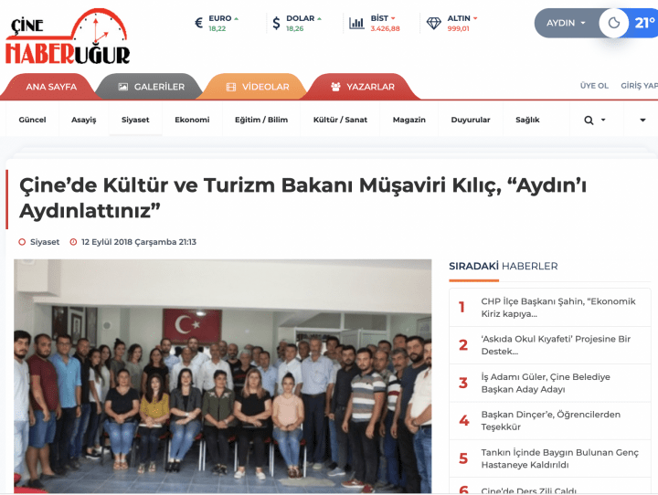 Aydın Çine’de Kültür ve Turizm Bakanı Müşaviri Kılıç: “Aydın’ı Aydınlattınız“ http://www.haberugur.com/siyaset/cinede-kultur-ve-turizm-bakani-musaviri-kilic-aydini-h5283.html