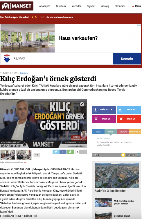 Memleket Havadis adlı bir haber sitesinin Sadettin Kılıç ile ilgili 14.03.2011 tarihinde „AK Parti’nin geçen dönem Milletvekili adayı olan Sadettin Kılıç, yeni dönem için aday adaylığını açıkladı“ diye yayınladığı haberinde Kılıç şunları ifade ediyor: „AK Parti’nin geçen dönem 4. sıra milletvekili adayı olan Sadettin Kılıç, müracaatı esnasında partililere yönelik AK Parti’nin iktidarı döneminden bugüne yapmış olduğu hizmetlere dikkat çekti. Kılıç, yaptığı konuşmasında: AK Parti’den aday olmak isteyen insanların parti ile kimyalarının uyumlu olmaları gerekli. Doku uyuşmazlığı olmamaları lazım. Beni tanıyanlar bilir.“