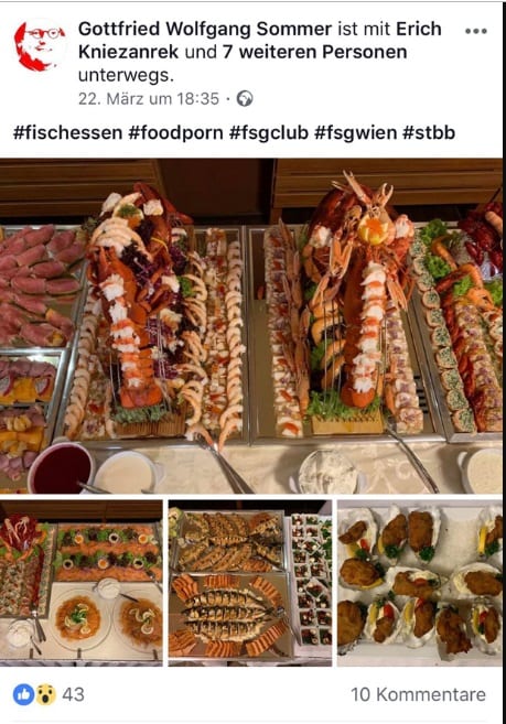 Viyana- Sendikacı ve aynı zamanda Avusturya Sosyal Demokrat Partisi (SPÖ) Viyana Mariahilf Kulüp Başkanı olan Gottfried W. Sommer (57),görünüşe göre pahalı ve lüks yemeklerin hayranı. Facebook’ta SPÖ’lü sendikacının, ıstakozlu yemek davetini ve arkadaşlarıyla geçirdiği bu akşamı, iştah kabartıcı yemek fotoğrafları için kullanılan “#foodporn” etiketiyle özetlediği bir paylaşımı dolaşımda. Bu seçkin yemeğin, Viyana Sosyal Demokrat Sendikacılar Grubu (FSG- Fraktion Sozialdemokratischer Gewerkschafter) “kulüp toplantısının” mönüsü olduğu söyleniyor. 22 Mart tarihli bu paylaşım, Sommer’in seçkin ve pahalı damak zevkini ortaya koyduğu ilk paylaşımı değil.