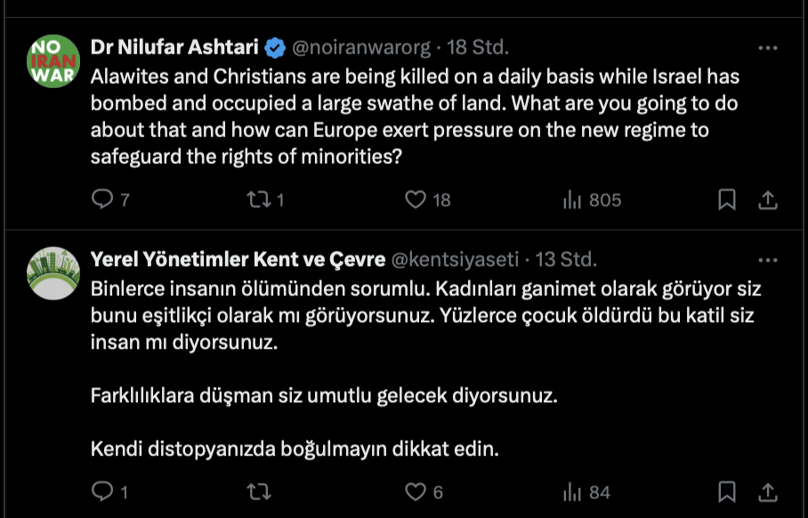 Lahbib´in X’de bu paylaşımın altına şu tepkiler geldi:“ Aleviler ve Hıristiyanlar her gün öldürülürken İsrail geniş bir toprak parçasını bombaladı ve işgal etti. Bu konuda ne yapacaksınız ve Avrupa azınlıkların haklarını korumak için yeni rejime nasıl baskı uygulayabilir?“