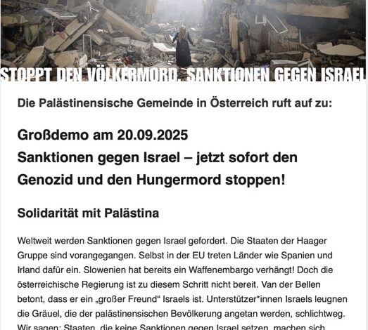 Mehr lesen »VİYANA- 20 Eylül 2025 Cumartesi günü Viyana’da Christian-Broda-Platz’ta saat 15:00 ile 18:00 arasında Filistin’e destek amacıyla bir miting düzenleneceği öğrenildi.…