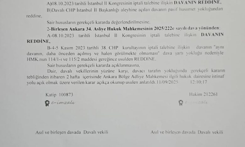 Mehr lesen »ANKARA. CHP’nin İstanbul kongresi İstanbul 45’inci Asliye Hukuk Mahkemesi tarafından iptal edilmiş ve bu kararla birlikte İl Başkanı Özgür Çelik ve…